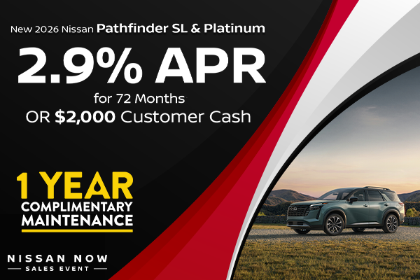 Example: 2026 Nissan Pathfinder SL. VIN: 5N1DR3CS2TC229185. MSRP: $45,110. 2.9% APR for 72 months. $15.15 per month per every $1,000 borrowed. Or Customer Cash $2,000. One year of complimentary maintenance includes one oil change and one tire rotation. Good on select new and used vehicles. See the dealer for complete maintenance details. Several in stock at this price. Advertised Price EXCLUDES all optional dealer offered items, accessories, or product addendums optionally selected by the purchaser, applicable official taxes and fees, and a $436 documentary fee. Offer Expires 03/31/2026.