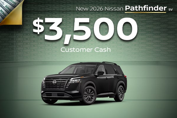 Example: 2026 Nissan Pathfinder SV. VIN: 5N1DR3BS2TC200674. MSRP: $42,960. Sale Price: $40,088. One year of complimentary maintenance includes one oil change and one tire rotation. Good on select new and used vehicles. See the dealer for complete maintenance details. Several in stock at this price. Advertised Price EXCLUDES all optional dealer offered items, accessories, or product addendums optionally selected by the purchaser, applicable official taxes and fees, and a $436 documentary fee. Offer Expires 04/30/2026.