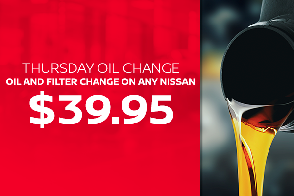 Plus tax and applicable fees. Valid only on Thursdays. Offer applies to oil and filter change on Nissan vehicles; excludes diesels and may incur additional charges for specialty oil or filters. May not be combined with any other offer. Must present coupon at time of service. See dealer for details. Offer Expires 03/31/2026.