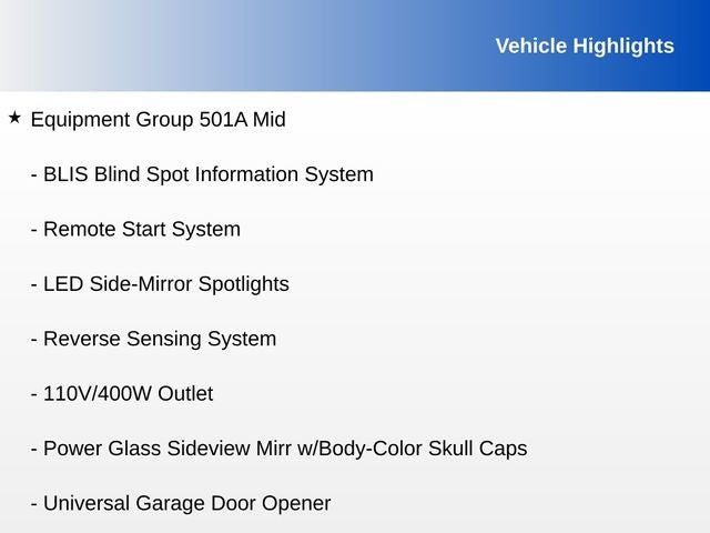 - Body-Colored Power Heated Side Mirrors w/Driver Auto Dimming, Convex Spotter, Power Folding and Turn Signal Indicator