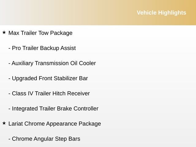 This Lariat trim level is packed with premium features that elevate your driving experience. The powerful 3.5L V6 EcoBoost engine, paired with a 6-speed automatic transmission and 4WD, delivers impressive performance and capability. The Max Trailer Tow Package ensures you can haul your toys with confidence, while the Lariat Chrome Appearance Package adds a touch of refined style.