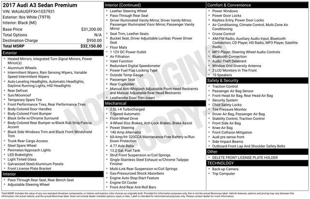 Clean CARFAX. Ibis White 2017 Audi A3 2.0T Premium FrontTrak FrontTrak 6-Speed Automatic S tronic 2.0L 4-Cylinder TFSI 10 Speakers, 4-Wheel Disc Brakes, ABS brakes, Air Conditioning, Alloy wheels, AM/FM radio: SiriusXM, Anti-whiplash front head restraints, Automatic temperature control, Brake assist, Bumpers: body-color, CD player, Delay-off headlights, Delete Front License Plate Holder, Driver door bin, Driver vanity mirror, Dual front impact airbags, Dual front side impact airbags, Electronic Stability Control, Exterior Parking Camera Rear, Four wheel independent suspension, Front anti-roll bar, Front Bucket Seats, Front Center Armrest, Front dual zone A/C, Front reading lights, Heated door mirrors, High intensity discharge headlights: Xenon plus, Illuminated entry, Knee airbag, Leather Seating Surfaces, Leather Shift Knob, Leather steering wheel, Low tire pressure warning, Occupant sensing airbag, Outside temperature display, Overhead airbag, Panic alarm, Passenger door bin, Passenger vanity mirror, Power door mirrors, Power driver seat, Power moonroof, Power steering, Power windows, Radio data system, Radio: Audi Concert AM/FM/1CD Player, Rain sensing wipers, Rear anti-roll bar, Rear fog lights, Rear reading lights, Rear seat center armrest, Rear window defroster, Remote keyless entry, Security system, Speed control, Speed-sensing steering, Speed-Sensitive Wipers, Split folding rear seat, Steering wheel mounted audio controls, Tachometer, Telescoping steering wheel, Tilt steering wheel, Traction control, Trip computer, Turn signal indicator mirrors, Variably intermittent wipers, Wheels: 7.5 x 17 5-Arm-Design.