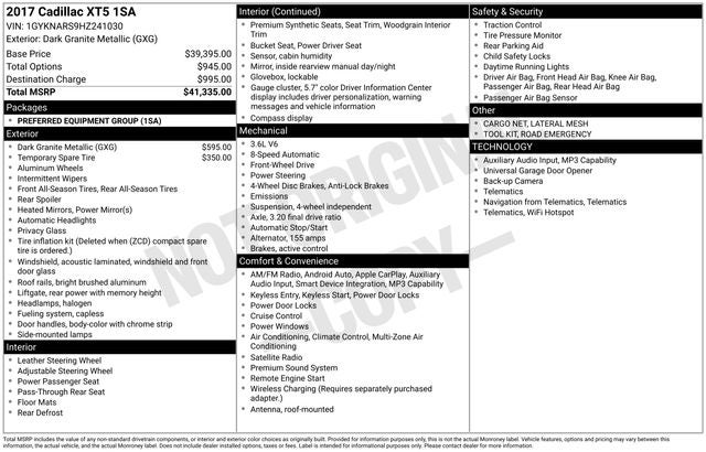 Clean CARFAX. Dark Granite Metallic 2017 Cadillac XT5 FWD 8-Speed Automatic 3.6L V6 DI VVT 3.20 Axle Ratio, 4-Wheel Disc Brakes, 4-Wheel Independent Suspension, 8 Speakers, ABS brakes, Air Conditioning, Alloy wheels, AM/FM radio: SiriusXM, Apple CarPlay/Android Auto, Automatic temperature control, Bodyside moldings, Bose Premium 8-Speaker Audio System Feature, Brake assist, Bumpers: body-color, Child-Seat-Sensing Airbag, Compass, Delay-off headlights, Driver door bin, Driver vanity mirror, Dual front impact airbags, Dual front side impact airbags, Electronic Stability Control, Emergency communication system: OnStar Directions & Connections, Exterior Parking Camera Rear, Four wheel independent suspension, Front anti-roll bar, Front Bucket Seats, Front Center Armrest, Front dual zone A/C, Front reading lights, Fully automatic headlights, Garage door transmitter, Heated door mirrors, Illuminated entry, Lateral Mesh Cargo Net, Leather steering wheel, Leatherette Seating Surfaces, Low tire pressure warning, Occupant sensing airbag, Outside temperature display, Overhead airbag, Overhead console, Panic alarm, Passenger door bin, Passenger vanity mirror, Power door mirrors, Power driver seat, Power Liftgate, Power passenger seat, Power steering, Power windows, Preferred Equipment Group 1SA, Premium audio system: Cadillac CUE, Radio data system, Radio: Cadillac CUE Info & Media Control System, Rear anti-roll bar, Rear Parking Sensors, Rear reading lights, Rear seat center armrest, Rear window defroster, Rear window wiper, Remote keyless entry, Road Emergency Tool Kit, Roof rack: rails only, SiriusXM Satellite Radio, Speed control, Speed-sensing steering, Split folding rear seat, Spoiler, Steering wheel mounted audio controls, Tachometer, Telescoping steering wheel, Tilt steering wheel, Traction control, Trip computer, Variably intermittent wipers, Voltmeter, Wheels: 18 x 8 Multi-Spoke Aluminum.