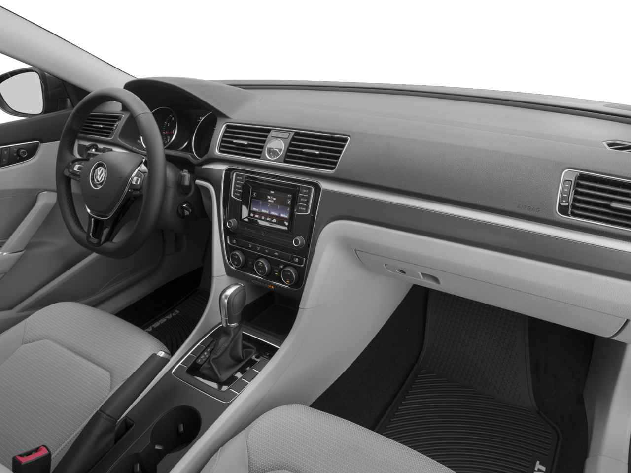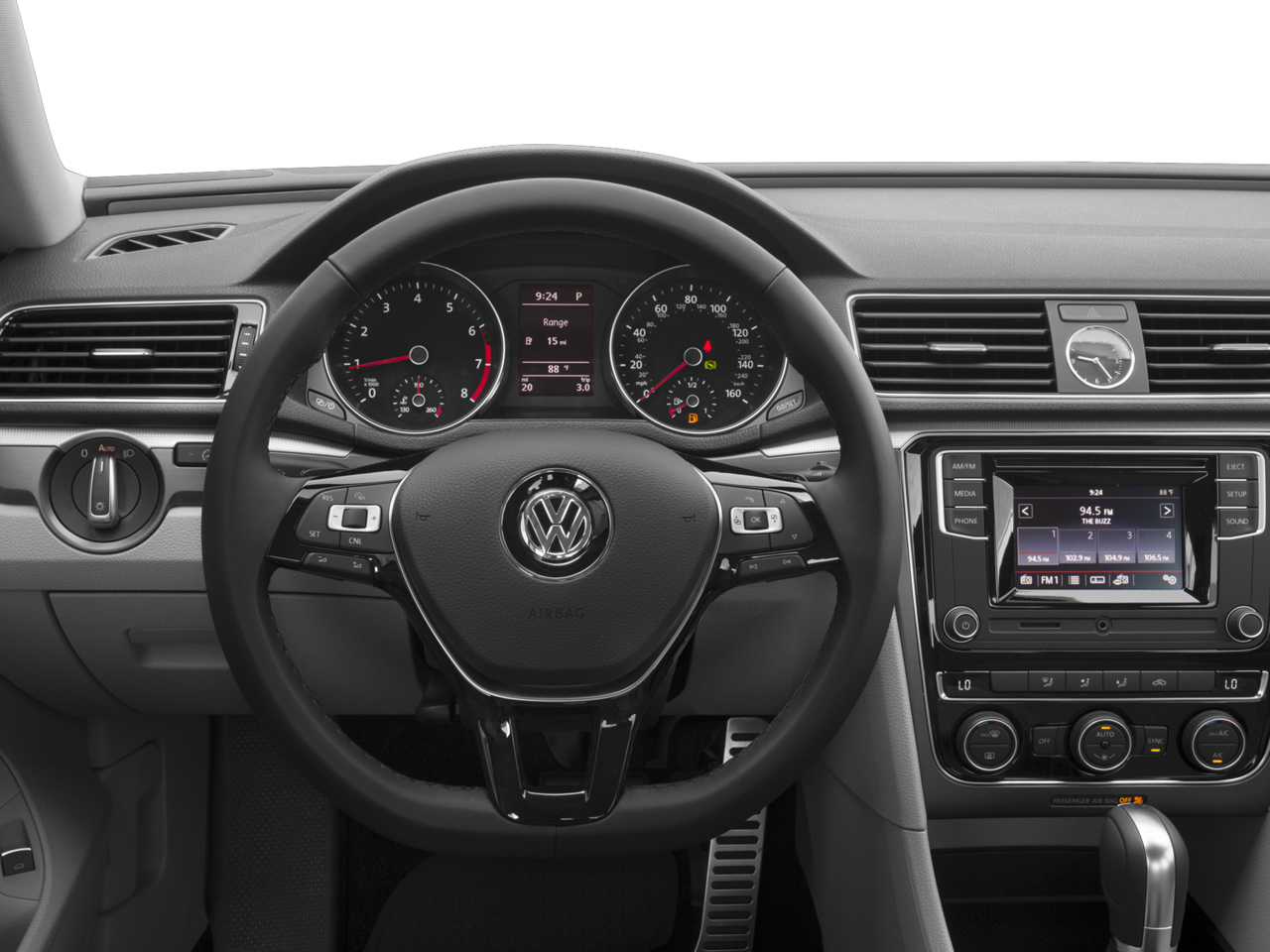 Step inside and you'll be greeted by a well-appointed cabin featuring premium V-Tex leatherette upholstery, heated front seats, and a Composition Media infotainment system with AM/FM radio, HD Radio, and a CD player. The power driver's seat, dual-zone automatic climate control, and leather-wrapped steering wheel add to the Passat's refined ambiance.