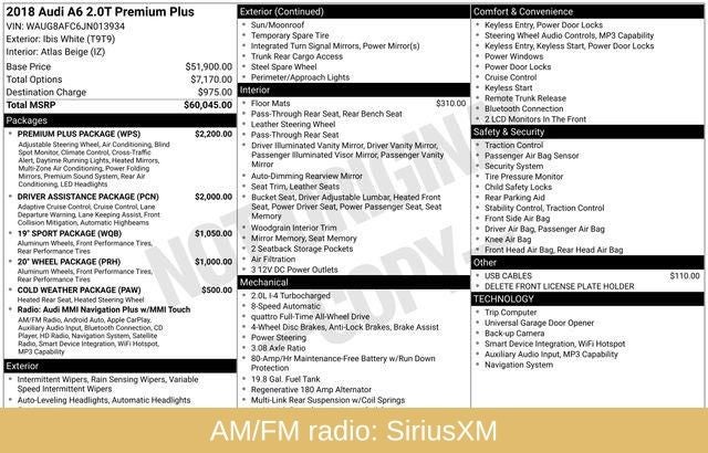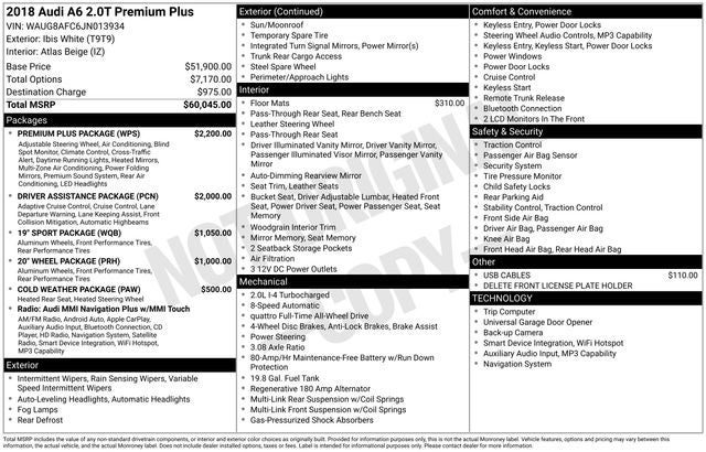 10 Speakers, AM/FM radio: SiriusXM, Audi Connect w/Online Services, Audi Sound System, Four wheel independent suspension, Heated Front Seats, Leather Seating Surfaces, Navigation System, Power door mirrors, Power driver seat, Power passenger seat, Radio: Audi MMI Navigation Plus w/MMI Touch, Remote keyless entry, Speed-sensing steering, Steering wheel mounted audio controls, USB Audi Music Interface, Wheels: 18 10-V-Spoke-Design, 4-Wheel Disc Brakes, ABS brakes, Air Conditioning, Alloy wheels, Anti-whiplash front head restraints, Auto-dimming door mirrors, Auto-dimming Rear-View mirror, Automatic temperature control, Brake assist, Bumpers: body-color, CD player, Compass, Delay-off headlights, Driver door bin, Driver vanity mirror, Dual front impact airbags, Dual front side impact airbags, Electronic Stability Control, Exterior Parking Camera Rear, Front anti-roll bar, Front Bucket Seats, Front Center Armrest w/Storage, Front dual zone A/C, Front fog lights, Front reading lights, Garage door transmitter: HomeLink, Genuine wood console insert, Genuine wood dashboard insert, Genuine wood door panel insert, Heated door mirrors, Heated front seats, High intensity discharge headlights: Bi-xenon, HVAC memory, Illuminated entry, Knee airbag, Leather Shift Knob, Leather steering wheel, Low tire pressure warning, Memory seat, Occupant sensing airbag, Outside temperature display, Overhead airbag, Panic alarm, Passenger door bin, Passenger vanity mirror, Power moonroof, Power steering, Power windows, Radio data system, Rain sensing wipers, Rear air conditioning, Rear anti-roll bar, Rear fog lights, Rear reading lights, Rear seat center armrest, Rear window defroster, Security system, Speed control, Speed-Sensitive Wipers, Split folding rear seat, Tachometer, Telescoping steering wheel, Tilt steering wheel, Traction control, Trip computer, Turn signal indicator mirrors, Variably intermittent wipers, 10 Speakers, AM/FM radio: SiriusXM, Audi Connect w/Online Services, Audi Sound System, Four wheel independent suspension, Heated Front Seats, Leather Seating Surfaces, Navigation System, Power door mirrors, Power driver seat, Power passenger seat, Radio: Audi MMI Navigation Plus w/MMI Touch, Remote keyless entry, Speed-sensing steering, Steering wheel mounted audio controls, USB Audi Music Interface, Wheels: 18 10-V-Spoke-Design.