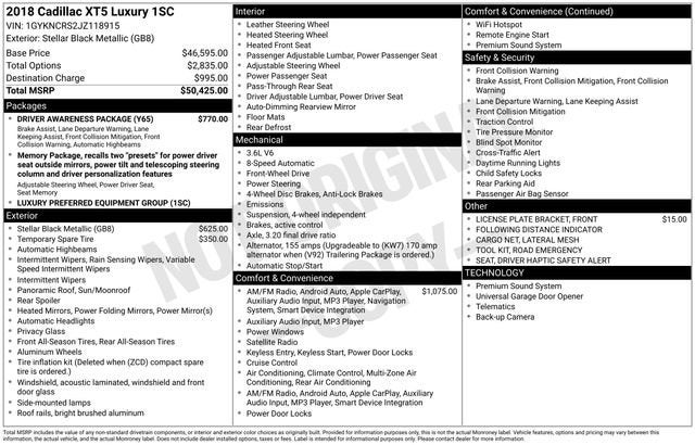 155 Amp Alternator, 2-Way Power Driver Lumbar Control Seat Adjuster, 2-Way Power Passenger Lumbar Control Seat Adjuster, 3.20 Axle Ratio, 4-Wheel Disc Brakes, 4-Wheel Independent Suspension, 8 Speakers, 8-Way Power Front Passenger Seat Adjuster, ABS brakes, Air Conditioning, Alloy wheels, AM/FM radio: SiriusXM, Apple CarPlay/Android Auto, Auto-dimming door mirrors, Auto-dimming Rear-View mirror, Automatic Dual-Zone Climate Control, Automatic temperature control, Body-Color Heated Power-Adjustable Outside Mirrors, Bodyside moldings, Bose Premium 8-Speaker Audio System Feature, Bose Studio Surround Sound w/14 Speakers, Brake assist, Bumpers: body-color, Compass, Delay-off headlights, Driver & Front Passenger Heated Seats, Driver Awareness Package, Driver door bin, Driver Haptic Safety Alert Seat, Driver vanity mirror, Dual front impact airbags, Dual front side impact airbags, Electronic Stability Control, Emergency communication system: OnStar and Cadillac connected services capable, Exterior Parking Camera Rear, Following Distance Indicator, Forward Collision Alert, Four wheel independent suspension, Front anti-roll bar, Front Bucket Seats, Front Center Armrest, Front dual zone A/C, Front License Plate Bracket, Front Pedestrian Detection, Front reading lights, Fully automatic headlights, Garage door transmitter, Halogen Headlamps, Heated door mirrors, Heated front seats, Heated steering wheel, Illuminated entry, Intellibeam Automatic High Beam On/Off Headlamps, Knee airbag, Lane Keep Assist w/Lane Departure Warning, Lateral Mesh Cargo Net, Leather Seating Surfaces w/Mini Perforated Inserts, Leather steering wheel, Low Speed Forward Automatic Braking, Low tire pressure warning, Luxury Package 1SC, Memory seat, Occupant sensing airbag, Outside temperature display, Overhead airbag, Overhead console, Panic alarm, Passenger door bin, Passenger vanity mirror, Power door mirrors, Power driver seat, Power Liftgate, Power moonroof, Power passenger seat, Power steering, Power windows, Radio data system, Radio: Cadillac User Experience, Radio: Cadillac User Experience w/Embedded Nav, Rain sensing wipers, Rear anti-roll bar, Rear reading lights, Rear seat center armrest, Rear window defroster, Rear window wiper, Remote keyless entry, Road Emergency Tool Kit, Roof rack: rails only, SiriusXM Satellite Radio, Speed control, Speed-sensing steering, Split folding rear seat, Spoiler, Steering wheel memory, Steering wheel mounted audio controls, Tachometer, Telescoping steering wheel, Tilt steering wheel, Traction control, Trip computer, Variably intermittent wipers, Voltmeter, Wheels: 18 x 8 Bright Machined Faced Aluminum.