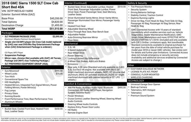 110-Volt AC Power Outlet, 150 Amp Alternator, 1st & 2nd Row Color-Keyed Carpeted Floor Mats, 20 x 9 Polished Aluminum Wheels, 4.2 Diagonal Color Display Driver Info Center, 6 Rectangular Chromed Tubular Assist Steps, Auto-Dimming Inside Rear-View Mirror, Auxiliary External Transmission Oil Cooler, Bose Speaker System, Chrome Bodyside Moldings, Chrome Door Handles, Chrome Mirror Caps, Color-Keyed Carpeting, Deep-Tinted Glass, Driver & Front Passenger Illuminated Vanity Mirrors, Dual-Zone Automatic Climate Control, Electric Rear-Window Defogger, EZ Lift & Lower Tailgate, GMC 4G LTE, Heavy-Duty Rear Locking Differential, Leather Wrapped Steering Wheel w/Cruise Controls, LED Cargo Box Lighting, LED Tailamps w/Signature, Manual Tilt/Telescoping Steering Column, OnStar & GMC Connected Services Capable, Power Adjustable Pedals, Power Folding & Adjustable Heated Outside Mirrors, Power Windows w/Driver Express Up & Down, Preferred Equipment Group 4SA, Rear 60/40 Folding Bench Seat (Folds Up), Rear Wheelhouse Liners, Remote Keyless Entry, Remote Vehicle Starter System, Single Slot CD/MP3 Player, SLT Premium Package, Steering Wheel Audio Controls, Theft Deterrent System (Unauthorized Entry), Thin Profile LED Fog Lamps, Trailering Equipment, Universal Home Remote, 10-Way Power Driver's Seat Adjuster, 4-Wheel Disc Brakes, 40/20/40 Front Split Bench Seat, 6 Speakers, 6-Speaker Audio System, ABS brakes, Adjustable pedals, Air Conditioning, Alloy wheels, AM/FM radio: SiriusXM, Auto-dimming door mirrors, Auto-dimming Rear-View mirror, Automatic temperature control, Bodyside moldings, Brake assist, Bumpers: chrome, CD player, Compass, Delay-off headlights, Driver door bin, Driver vanity mirror, Dual front impact airbags, Dual front side impact airbags, Electronic Stability Control, Exterior Parking Camera Rear, Floor Mounted Console, Front anti-roll bar, Front Center Armrest w/Storage, Front dual zone A/C, Front fog lights, Front Full Feature Power Reclining Bucket Seats, Front License Plate Kit, Front reading lights, Front wheel independent suspension, Fully automatic headlights, Garage door transmitter, GMC Connected Access, HD Radio, Heated & Ventilated Front Bucket Seats, Heated door mirrors, Heated Driver & Front Passenger Seats, Heated front seats, Heavy Duty Suspension, High-Intensity Discharge Headlights, Illuminated entry, Leather Appointed Seat Trim, Low tire pressure warning, Memory seat, Occupant sensing airbag, Outside temperature display, Overhead airbag, Overhead console, Panic alarm, Passenger door bin, Passenger vanity mirror, Power door mirrors, Power driver seat, Power passenger seat, Power steering, Power Sunroof, Power windows, Premium audio system: GMC Infotainment System, Radio data system, Radio: AM/FM/GMC Infotainment & Navigation, Radio: AM/FM/GMC Infotainment System, Rear reading lights, Rear seat center armrest, Rear step bumper, Rear window defroster, Remote keyless entry, Remote Locking Tailgate, Security system, SiriusXM Satellite Radio, Speed control, Speed-sensing steering, Split folding rear seat, Steering wheel mounted audio controls, Tachometer, Telescoping steering wheel, Tilt steering wheel, Traction control, Trip computer, Turn signal indicator mirrors, Variably intermittent wipers, Voltmeter, Wheel Locks (Set of 4) (LPO), Wheels: 18 x 8.5 Polished Aluminum, Wireless Charging, 110-Volt AC Power Outlet, 150 Amp Alternator, 1st & 2nd Row Color-Keyed Carpeted Floor Mats, 20 x 9 Polished Aluminum Wheels, 4.2 Diagonal Color Display Driver Info Center, 6 Rectangular Chromed Tubular Assist Steps, Auto-Dimming Inside Rear-View Mirror, Auxiliary External Transmission Oil Cooler, Bose Speaker System, Chrome Bodyside Moldings, Chrome Door Handles, Chrome Mirror Caps, Color-Keyed Carpeting, Deep-Tinted Glass, Driver & Front Passenger Illuminated Vanity Mirrors, Dual-Zone Automatic Climate Control, Ele