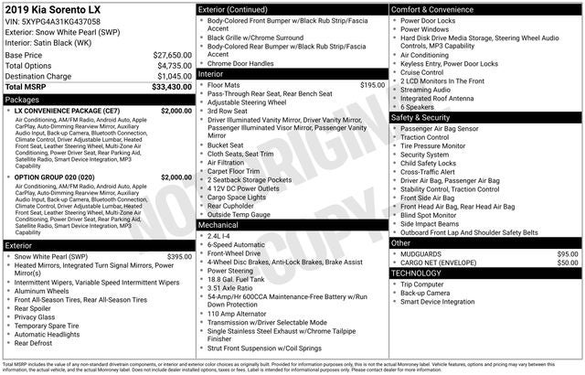 CARFAX One-Owner. Snow White Pearl 2019 Kia Sorento LX FWD 6-Speed Automatic with Sportmatic I4 10-Way Power Adjustable Driver Seat, 17 x 7.0 Alloy Wheels, 3.51 Axle Ratio, 3rd row seats: split-bench, 4-Wheel Disc Brakes, 6 Speakers, ABS brakes, Air Conditioning, Alloy wheels, AM/FM radio, Apple CarPlay & Android Auto, Auto-Dimming Rear-View Mirror, Brake assist, Bumpers: body-color, Cargo Net (Envelope), Carpeted Floor Mats (7-Passenger), Delay-off headlights, Driver door bin, Driver vanity mirror, Dual front impact airbags, Dual front side impact airbags, Dual Zone Automatic Climate Control, Electronic Stability Control, Exterior Parking Camera Rear, Four wheel independent suspension, Front anti-roll bar, Front Bucket Seats, Front Center Armrest, Front reading lights, Fully automatic headlights, Heated door mirrors, Heated Front Seats, Illuminated entry, Leather Wrapped Steering Wheel & Shift Knob, Low tire pressure warning, LX Convenience Package, Mudguards, Occupant sensing airbag, Outside temperature display, Overhead airbag, Overhead console, Panic alarm, Park Distance Warning-Reverse, Passenger door bin, Passenger vanity mirror, Power door mirrors, Power steering, Power windows, Radio data system, Radio: UVO eServices, Radio: UVO Play w/AM/FM/MP3, Rear anti-roll bar, Rear seat center armrest, Rear window defroster, Rear window wiper, Remote keyless entry, Roof Rails (Silver), Security system, Speed control, Speed-sensing steering, Split folding rear seat, Spoiler, Steering wheel mounted audio controls, Tachometer, Telescoping steering wheel, Tilt steering wheel, Traction control, Trip computer, Turn signal indicator mirrors, Variably intermittent wipers, YES Essentials Cloth Seat Trim.