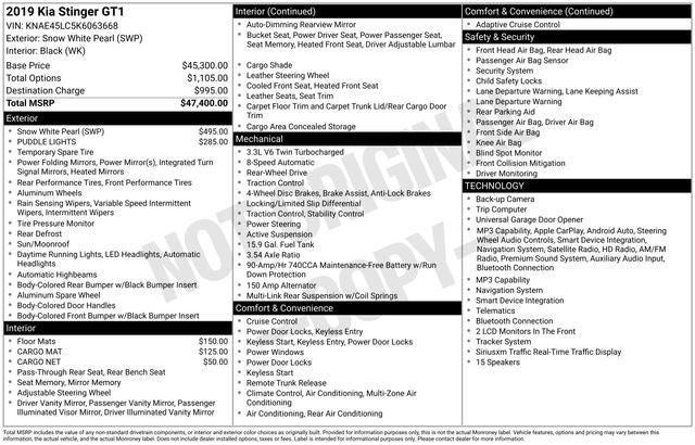 Priced below KBB Fair Purchase Price! Snow White Pearl 2019 Kia Stinger GT1 3.3L V6 8-Speed Automatic RWD