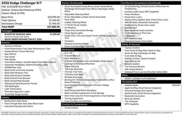 Octane Red Pearlcoat 2020 Dodge Challenger R/T RWD Tremec 6-Speed Manual HEMI 5.7L V8 VVT WE DELIVER ANYWHERE, Ford Blue Advantage Blue Certified Certified, Black Fuel Filler Door, Black Grille w/Bezel, Blacktop Package, Blacktop R/T Badge, Challenger Blacktop Grille Badge, Gloss Black I/P Cluster Trim Rings, HEMI Blacktop Fender Badge, Rear Black Spoiler, Satin Black Dodge Tail Lamp Badge, Wheels: 20 x 8.0 Black Noise Painted, 230MM Rear Axle, 3.90 Rear Axle Ratio, 4-Wheel Disc Brakes, 6 Speakers, ABS brakes, Air Conditioning, Alloy wheels, AM/FM radio, Anti-whiplash front head restraints, Apple CarPlay, Apple CarPlay/Android Auto, Auto-dimming Rear-View mirror, Automatic temperature control, Brake assist, Bumpers: body-color, Compass, Delay-off headlights, Driver door bin, Driver vanity mirror, Dual front impact airbags, Dual front side impact airbags, Electronic Stability Control, Four wheel independent suspension, Front anti-roll bar, Front Bucket Seats, Front Center Armrest, Front dual zone A/C, Front fog lights, Front License Plate Bracket, Front reading lights, Fully automatic headlights, Garage door transmitter, Google Android Auto, GPS Antenna Input, Heated door mirrors, Houndstooth Cloth Performance Seats, Illuminated entry, Integrated Center Stack Radio, Integrated Voice Command w/Bluetooth®, Leather Shift Knob, Low tire pressure warning, Media Hub (2 USB, AUX), Outside temperature display, Overhead airbag, Overhead console, Panic alarm, ParkView Rear Back-Up Camera, Passenger door bin, Passenger vanity mirror, Performance Steering, Power door mirrors, Power driver seat, Power steering, Power windows, Quick Order Package 22H R/T, Radio data system, Radio: Uconnect 4 w/7 Display, Rear anti-roll bar, Rear reading lights, Rear seat center armrest, Rear window defroster, Remote keyless entry, Security system, SiriusXM Satellite Radio, Speed control, Speed-sensing steering, Split folding rear seat, Spoiler, Sport steering wheel, Steering wheel mounted audio controls, Tachometer, Telescoping steering wheel, Tilt steering wheel, Traction control, Trip computer, USB Host Flip, Variably intermittent wipers, Wheels: 20 x 8 Satin Carbon Aluminum, Black Fuel Filler Door, Black Grille w/Bezel, Blacktop Package, Blacktop R/T Badge, Challenger Blacktop Grille Badge, Gloss Black I/P Cluster Trim Rings, HEMI Blacktop Fender Badge, Rear Black Spoiler, Satin Black Dodge Tail Lamp Badge, Wheels: 20 x 8.0 Black Noise Painted.