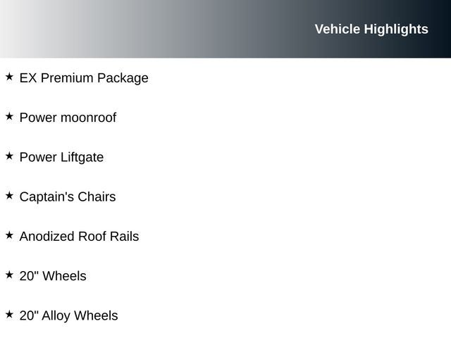 - Luxurious EX Premium Package featuring Anodized Roof Rails, 20 Alloy Wheels, and 2nd Row Captain's Chairs