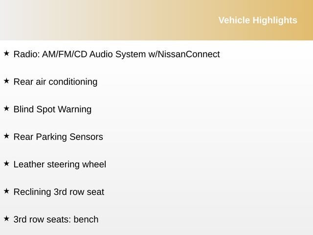 - Radio: AM/FM/CD Audio System w/NissanConnect -inc: 6 speakers, 8" color display w/multi-touch control, HD Radio, SiriusXM satellite radio, USB connection ports (2 type A) for iPod interface and other compatible devices, SiriusXM Travel Link (weather, fuel prices, movie listings, stock info and sports), Bluetooth® hands-free phone system and streaming audio via Bluetooth®