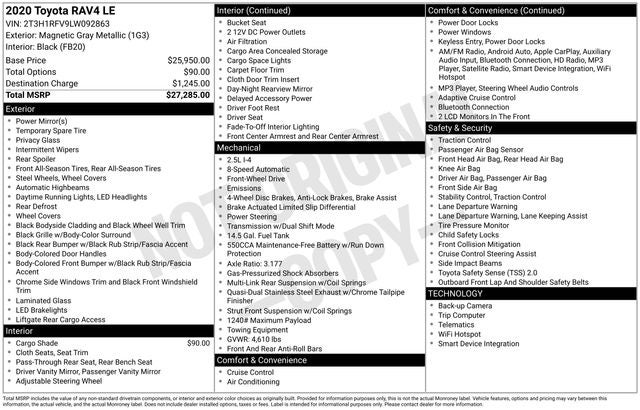 Gray 2020 Toyota RAV4 LE FWD 8-Speed Automatic 2.5L 4-Cylinder DOHC Dual VVT-i 17 Steel Wheels, 4-Wheel Disc Brakes, 6 Speakers, ABS brakes, Air Conditioning, AM/FM radio: SiriusXM, AM/FM Stereo, Apple CarPlay/Android Auto, Auto High-beam Headlights, Axle Ratio: 3.177, Brake assist, Bumpers: body-color, Driver door bin, Driver vanity mirror, Dual front impact airbags, Dual front side impact airbags, Electronic Stability Control, Emergency communication system: Entune Safety Connect, Exterior Parking Camera Rear, Fabric Seat Trim, Four wheel independent suspension, Front anti-roll bar, Front Bucket Seats, Front Center Armrest, Front reading lights, Illuminated entry, Knee airbag, Low tire pressure warning, Occupant sensing airbag, Outside temperature display, Overhead airbag, Overhead console, Panic alarm, Passenger door bin, Passenger vanity mirror, Power door mirrors, Power steering, Power windows, Radio data system, Rear anti-roll bar, Rear seat center armrest, Rear window defroster, Rear window wiper, Remote keyless entry, Roof rack: rails only, Speed control, Speed-sensing steering, Split folding rear seat, Spoiler, Steering wheel mounted audio controls, Tachometer, Telescoping steering wheel, Tilt steering wheel, Traction control, Trip computer.