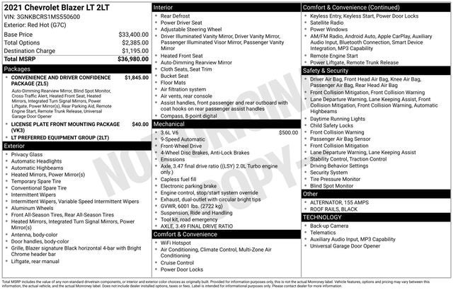 Red Hot 2021 Chevrolet Blazer LT FWD 9-Speed Automatic 3.6L V6 SIDI DOHC VVT WE DELIVER ANYWHERE, 155 Amp Alternator, 170 Amp Alternator, 4-Wheel Disc Brakes, 6 Speakers, 6-Speaker Audio System Feature, ABS brakes, Air Conditioning, Alloy wheels, AM/FM radio: SiriusXM, Apple CarPlay/Android Auto, Auto High-beam Headlights, Automatic temperature control, Black Roof Rails, Brake assist, Bumpers: body-color, Child-Seat-Sensing Airbag, Compass, Convenience & Driver Confidence Package, Delay-off headlights, Driver door bin, Driver vanity mirror, Dual front impact airbags, Dual front side impact airbags, Electronic Stability Control, Emergency communication system: OnStar and Chevrolet connected services capable, Exterior Parking Camera Rear, Four wheel independent suspension, Front anti-roll bar, Front Bucket Seats, Front Center Armrest, Front dual zone A/C, Front reading lights, Fully automatic headlights, Heated door mirrors, Heated Driver & Front Passenger Seats, High-Intensity Discharge Headlights, Illuminated entry, Inside Rear-View Auto-Dimming Mirror, Knee airbag, Lane Change Alert w/Side Blind Zone Alert, Leather Shift Knob, Low tire pressure warning, Occupant sensing airbag, Outside Heated Power-Adjustable Body-Color Mirrors, Outside temperature display, Overhead airbag, Overhead console, Panic alarm, Passenger door bin, Passenger vanity mirror, Power door mirrors, Power driver seat, Power steering, Power windows, Preferred Equipment Group 2LT, Premium Cloth Seat Trim, Radio data system, Radio: Chevrolet Infotainment 3 System, Rear anti-roll bar, Rear Cross Traffic Alert, Rear Park Assist w/Audible Warning, Rear Power Programmable Liftgate, Rear reading lights, Rear seat center armrest, Rear window defroster, Rear window wiper, Remote keyless entry, Remote Start, Ride & Handling Suspension, Security system, SiriusXM Radio, Speed control, Speed-sensing steering, Split folding rear seat, Spoiler, Steering wheel mounted audio controls, Tachometer, Telescoping steering wheel, Tilt steering wheel, Traction control, Trip computer, Universal Home Remote, Variably intermittent wipers, Voltmeter, Wheels: 18 Bright Silver Aluminum.