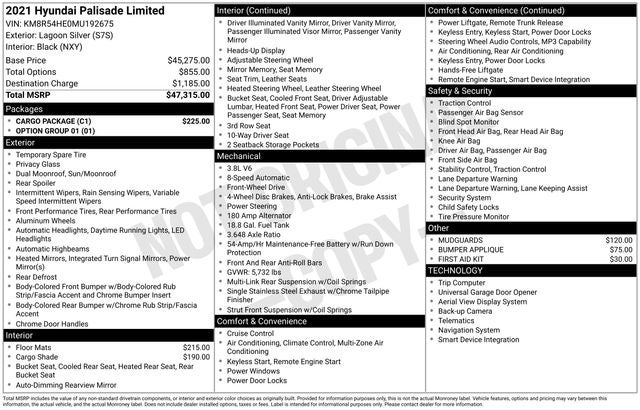 Lagoon Silver 2021 Hyundai Palisade Limited FWD 8-Speed Automatic with SHIFTRONIC V6 WE DELIVER ANYWHERE, Cargo Block, Cargo Net, Cargo Package, Cargo Tray, Option Group 01, 12 Speakers, 3.648 Axle Ratio, 3rd row seats: split-bench, 4-Wheel Disc Brakes, ABS brakes, Air Conditioning, Alloy wheels, AM/FM radio: SiriusXM, Apple CarPlay & Android Auto, Auto High-beam Headlights, Auto-dimming Rear-View mirror, Auto-leveling suspension, Automatic temperature control, Brake assist, Bumper Applique, Bumpers: body-color, Cargo Cover/Screen, Carpeted Floor Mats, Compass, Delay-off headlights, Driver door bin, Driver vanity mirror, Dual front impact airbags, Dual front side impact airbags, Electronic Stability Control, Emergency communication system: Blue Link Connected Car Service (3-year complimentary subscription), First Aid Kit, Four wheel independent suspension, Front anti-roll bar, Front Bucket Seats, Front Center Armrest, Front dual zone A/C, Front reading lights, Fully automatic headlights, Garage door transmitter: HomeLink, harman/kardon® Speakers, Heads-Up Display, Heated & Ventilated Front Bucket Seats, Heated door mirrors, Heated front seats, Heated rear seats, Heated steering wheel, Illuminated entry, Knee airbag, Low tire pressure warning, Memory seat, Mudguards, Navigation System, Occupant sensing airbag, Outside temperature display, Overhead airbag, Overhead console, Panic alarm, Passenger door bin, Passenger vanity mirror, Power door mirrors, Power driver seat, Power Liftgate, Power moonroof, Power passenger seat, Power steering, Power windows, Premium Nappa Leather Seat Trim, Radio data system, Radio: AM/FM/MP3 Premium Audio System, Rain sensing wipers, Rear air conditioning, Rear anti-roll bar, Rear reading lights, Rear window defroster, Rear window wiper, Reclining 3rd row seat, Remote keyless entry, Security system, Speed control, Speed-sensing steering, Split folding rear seat, Spoiler, Steering wheel mounted audio controls, Tachometer, Telescoping steering wheel, Tilt steering wheel, Traction control, Trip computer, Turn signal indicator mirrors, Variably intermittent wipers, Ventilated front seats, Ventilated rear seats, Wheels: 20 x 7.5J Split 5-Spoke Machined Alloy, Cargo Block, Cargo Net, Cargo Package, Cargo Tray, Option Group 01.