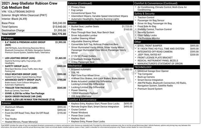 Bright White Clearcoat 2021 Jeep Gladiator Rubicon 3.6L V6 24V VVT 8-Speed Automatic 4WD1-Year SiriusXM Guardian Trial, 240 Amp Alternator, 4-Wheel Disc Brakes, 4:1 Rock-Trac HD Full Time 4WD System, 4.10 Rear Axle Ratio, 5-Year SiriusXM Traffic Service, 5-Year SiriusXM Travel Link Service, 8 Speakers, 8.4 Radio & Premium Audio Group, 8.4 Touchscreen Display, 97 mph Maximum Speed Calibration, ABS brakes, Advanced Brake Assist, Advanced Safety Group, Air Conditioning, Alloy wheels, Alpine Premium Audio System, AM/FM radio: SiriusXM, Apple CarPlay/Android Auto, Auto High Beam Headlamp Control, Auto-Dimming Rear-View Mirror, Automatic temperature control, Blind Spot & Cross Path Detection, Brake assist, Class IV Hitch Receiver, Cold Weather Group, Compass, Daytime Running Lamps LED Accents, Delay-off headlights, Driver door bin, Driver vanity mirror, Dual front impact airbags, Dual front side impact airbags, Electronic Stability Control, Emergency/Assistance Call, For Details, Visit DriveUconnect.com, Front anti-roll bar, Front Bucket Seats, Front Center Armrest w/Storage, Front dual zone A/C, Front fog lights, Front LED Fog Lamps, Front License Plate Bracket, Front reading lights, Full Speed Forward Collision Warning Plus, Fully automatic headlights, Garage door transmitter, GPS Navigation, GVWR: 6,250 lbs w/Max Tow Package, HD Radio, Heated door mirrors, Heated Front Seats, Heated Steering Wheel, Heavy-Duty Engine Cooling, Illuminated entry, Integrated Off-Road Camera, Integrated roll-over protection, Jeep Trail Rated Kit, Leather steering wheel, LED Lighting Group, LED Park Turn Lamps, LED Premium Reflector Headlamps, LED Taillamps, Low tire pressure warning, Manufacturer's Statement of Origin, MOPAR All-Weather Floor Mats (DISC), MOPAR Spray In Bedliner, Occupant sensing airbag, Outside temperature display, Panic alarm, ParkSense Rear Park Assist System, ParkView Rear Back-Up Camera, Passenger door bin, Passenger vanity mirror, Performance Suspension, Power door mirrors, Power steering, Power windows, Premium Cloth Low-Back Bucket Seats, Quick Order Package 24R, Radio data system, Radio: Uconnect 4 w/7 Display, Radio: Uconnect 4C Nav w/8.4 Display, Rear anti-roll bar, Rear reading lights, Redical Instrument Panel Bezels, Remote keyless entry, Remote Proximity Keyless Entry, Remote Start System, Safety Group, Security system, SiriusXM Traffic Plus, SiriusXM Travel Link, Speed control, Split folding rear seat, Steel Front Bumper, Steering wheel mounted audio controls, Tachometer, Telescoping steering wheel, Tilt steering wheel, Traction control, Trailer Hitch Zoom, Trailer Tow Package, Trip computer, Variably intermittent wipers, Voltmeter, Wheels: 17 x 7.5 Granite Crystal Aluminum, Wheels: 17 x 7.5 Polished Black Aluminum.Awards:* JD Power Initial Quality Study (IQS)