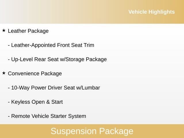 - Convenience Package includes (CJ2) dual-zone automatic climate control, (A2X) 10-way power driver seat including power lumbar, (KA1) heated driver and passenger seats, (NP5) leather-wrapped steering wheel, (KI3) heated steering wheel, (N37) manual tilt/telescoping steering column, (KI4) 120-volt power outlet, (KC9) 120-volt bed-mounted power outlet, (UBI) 2 charge-only USB ports for second row, (C49) rear-window defogger, (AVJ) Keyless Open and Start, (BTV) Remote Start and (UTJ) content theft alarm. (Upgradeable to (A50) bucket seats and includes (D07) center console. Vehicles built prior to 3-14-2022 and after 4-24-2022 include heated driver and front outboard passenger seats. Certain vehicles built on or after 3-14-2022 through 4-24-2022 will be forced to include (00V) Not Equipped with Heated or Ventilated Front Seats, which removes heated front seats. Vehicles equipped with (00V) Not Equipped with Heated or Ventilated Front Seats will be eligible for later dealer retrofit to enable functionality. Certain vehicles built prior to 3-28-2022 may be forced to include (00G) Not Equipped with Heated Steering Wheel, which removes the heated steering wheel. See dealer for details or the window label for the features on a specific vehicle.)