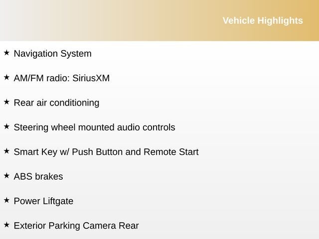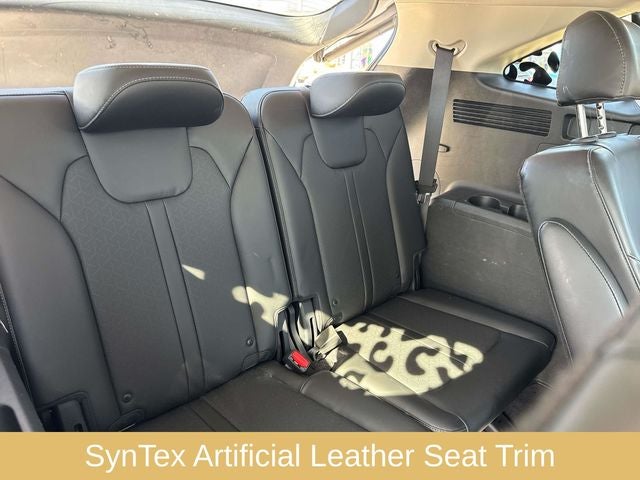 3rd row seats: split-bench, AM/FM radio: SiriusXM, Apple CarPlay & Android Auto, Exterior Parking Camera Rear, Heated Front Bucket Seats, Heated front seats, Navigation System, Rear air conditioning, SynTex Artificial Leather Seat Trim, 3.316 Axle Ratio, 4-Wheel Disc Brakes, 6 Speakers, ABS brakes, Air Conditioning, Alloy wheels, Auto High-beam Headlights, Automatic temperature control, Brake assist, Bumpers: body-color, Carpeted Floor Mats, Cross Bars (Interim), Delay-off headlights, Driver door bin, Driver vanity mirror, Dual front impact airbags, Dual front side impact airbags, Electronic Stability Control, Emergency communication system: UVO Link, Folding Cargo Tray, Four wheel independent suspension, Front anti-roll bar, Front Bucket Seats, Front Center Armrest, Front dual zone A/C, Front fog lights, Front reading lights, Fully automatic headlights, Heated door mirrors, Illuminated entry, Knee airbag, Leather Shift Knob, Leather steering wheel, Low tire pressure warning, Occupant sensing airbag, Outside temperature display, Overhead airbag, Overhead console, Panic alarm, Passenger door bin, Passenger vanity mirror, Power door mirrors, Power driver seat, Power Liftgate, Power steering, Power windows, Radio data system, Radio: AM/FM Audio System, Rear anti-roll bar, Rear reading lights, Rear window defroster, Rear window wiper, Remote keyless entry, Roof rack: rails only, Security system, Smart Key w/ Push Button and Remote Start, Speed control, Speed-sensing steering, Split folding rear seat, Spoiler, Steering wheel mounted audio controls, Tachometer, Telescoping steering wheel, Tilt steering wheel, Traction control, Trip computer, Turn signal indicator mirrors, Variably intermittent wipers, Wheel Locks, Wheels: 7.5J x 18 Machine-Finished Alloy, 3rd row seats: split-bench, AM/FM radio: SiriusXM, Apple CarPlay & Android Auto, Exterior Parking Camera Rear, Heated Front Bucket Seats, Heated front seats, Navigation System, Rear air conditioning, SynTex Artificial Leather Seat Trim.