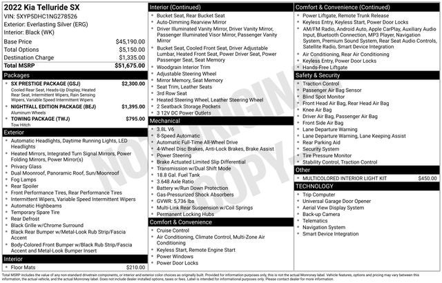 CARFAX One-Owner. Priced below KBB Fair Purchase Price! Everlasting Silver 2022 Kia Telluride SX AWD 8-Speed Automatic 3.8L V6 DOHC 10 Speakers, 110V Inverter, 3.648 Axle Ratio, 3rd row seats: split-bench, 4-Wheel Disc Brakes, ABS brakes, Air Conditioning, Alloy wheels, AM/FM radio: SiriusXM, Apple CarPlay & Android Auto, Auto High-beam Headlights, Auto-dimming Rear-View mirror, Automatic temperature control, Black Finish Radiator Grille, Body Color Exterior Door Handles, Brake assist, Bumpers: body-color, Carpeted Floor Mats, Compass, Delay-off headlights, Driver door bin, Driver vanity mirror, Dual front impact airbags, Dual front side impact airbags, Electronic Stability Control, Emergency communication system: 911 Connect, Exclusive Black Fog Light Bezel, Exclusive Black Headlight Bezels, Four wheel independent suspension, Front & Rear Gloss Black Finish Bumper Skid Plates, Front anti-roll bar, Front Bucket Seats, Front Center Armrest, Front dual zone A/C, Front fog lights, Front reading lights, Fully automatic headlights, Garage door transmitter: HomeLink, Gloss Black Finish Exterior Emblems, Gloss Black Finish Front & Rear Door Garnish, Gloss Black Finish Roof Rails, harman/kardon® Speakers, Heads-Up Display, Heated & Ventilated 2nd Row Seats, Heated & Ventilated Front Bucket Seats, Heated door mirrors, Heated front seats, Heated steering wheel, Illuminated entry, Knee airbag, Leather Seat Trim, Leather Shift Knob, Leather steering wheel, Low tire pressure warning, Memory seat, Multicolored Interior Light Kit, Navigation System, Nightfall Edition Package, Occupant sensing airbag, Outside temperature display, Overhead airbag, Overhead console, Panic alarm, Passenger door bin, Passenger vanity mirror, Power door mirrors, Power driver seat, Power Liftgate, Power moonroof, Power passenger seat, Power steering, Power windows, Premium Cloth Headliner & Pillar Trim, Premium Nappa Leather Seat Trim, Radio data system, Radio: AM/FM harman/kardon Audio System, Rain-Sensing Front Windshield Wipers, Rear air conditioning, Rear anti-roll bar, Rear audio controls, Rear reading lights, Rear window defroster, Rear window wiper, Reclining 3rd row seat, Remote keyless entry, Roof rack: rails only, Security system, Self Leveling Rear Suspension, Smart Key w/ Push Button and Remote Start, Speed control, Speed-sensing steering, Split folding rear seat, Spoiler, Steering wheel mounted audio controls, SX Prestige Package, Tachometer, Telescoping steering wheel, Tilt steering wheel, Tow Hitch w/Harness (TOF), Towing Package, Traction control, Trip computer, Turn signal indicator mirrors, Variably intermittent wipers, Ventilated front seats, Wheels: 20 x 7.5 Black Alloy, Wheels: 20 x 7.5 Exclusive Black Alloy.