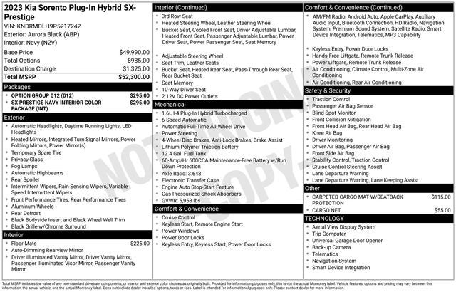 Clean CARFAX. Priced below KBB Fair Purchase Price! Aurora Black 2023 Kia Sorento Plug-In Hybrid SX Prestige AWD 6-Speed Automatic 1.6L I4 DGI Hybrid Turbocharged DOHC 16V LEV3-ULEV70 12 Speakers, 3rd row seats: split-bench, 4-Wheel Disc Brakes, ABS brakes, Air Conditioning, Alloy wheels, AM/FM radio: SiriusXM, Apple CarPlay & Android Auto, Auto High-beam Headlights, Auto-dimming Rear-View mirror, Automatic temperature control, Axle Ratio: 3.648, Brake assist, Bumpers: body-color, Cargo Net, Carpet Floor Mats, Carpeted Cargo Mat w/Seatback Protection, Delay-off headlights, Driver door bin, Driver vanity mirror, Dual front impact airbags, Dual front side impact airbags, Electronic Stability Control, Emergency communication system, Four wheel independent suspension, Front anti-roll bar, Front Bucket Seats, Front Center Armrest, Front dual zone A/C, Front fog lights, Front reading lights, Fully automatic headlights, Garage door transmitter: HomeLink, Genuine Perforated Leather Seat Trim, Heated & Ventilated Front Bucket Seats, Heated door mirrors, Heated front seats, Heated rear seats, Heated steering wheel, Illuminated entry, Knee airbag, Leather steering wheel, Low tire pressure warning, Memory seat, Navigation System, Navy Leather Seat Trim, Occupant sensing airbag, Outside temperature display, Overhead airbag, Overhead console, Panic alarm, Passenger door bin, Passenger vanity mirror, Power door mirrors, Power driver seat, Power Liftgate, Power passenger seat, Power steering, Power windows, Radio data system, Radio: AM/FM/HD Radio/SiriusXM Audio System, Rain sensing wipers, Rear air conditioning, Rear anti-roll bar, Rear reading lights, Rear window defroster, Rear window wiper, Remote keyless entry, Roof rack: rails only, Security system, Smart Key w/ Push Button and Remote Start, Speed control, Speed-sensing steering, Split folding rear seat, Spoiler, Steering wheel mounted audio controls, SX Prestige Navy Interior Color Package, Tachometer, Telescoping steering wheel, Tilt steering wheel, Traction control, Trip computer, Turn signal indicator mirrors, Variably intermittent wipers, Ventilated front seats, Wheels: 19 Machine-Finished Alloy.