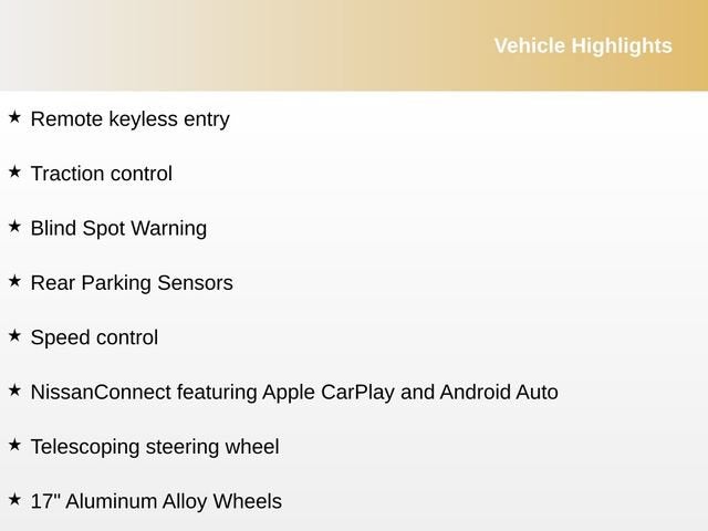 - Radio: AM/FM -inc: 4 speakers, NissanConnect featuring Apple CarPlay and Android Auto, SiriusXM Radio, 8" color touch screen display and Bluetooth®