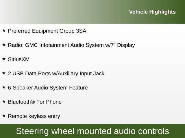 2 USB Data Ports w/Auxiliary Input Jack, 4.2 Multi-Color Driver Information Screen, 6-Speaker Audio System Feature, Alloy wheels, Auto High-beam Headlights, Bluetooth® For Phone, Emergency communication system: OnStar and GMC connected services capable, Fully automatic headlights, Heated door mirrors, Illuminated entry, Panic alarm, Preferred Equipment Group 3SA, Premium Cloth Seat Trim, Radio: GMC Infotainment Audio System w/7 Display, Remote keyless entry, Security system, SiriusXM, Steering wheel mounted audio controls, Wheels: 17 x 7 Silver Painted Aluminum, Wireless Apple CarPlay/Wireless Android Auto.