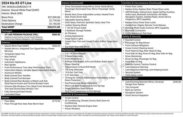 Powered by a potent 1.6L I4 DGI Turbocharged DOHC 16V engine, this K5 GT-Line delivers an exhilarating 180 horsepower, ensuring an engaging and responsive driving experience. Paired with an 8-speed automatic transmission and front-wheel drive, this sedan seamlessly blends power and efficiency, achieving an impressive 27 MPG in the city and 37 MPG on the highway.