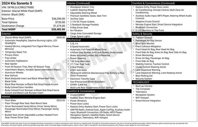 Glacial White Pearl 2024 Kia Sorento S AWD 8-Speed Automatic 2.5L I4 DGI DOHC 16V LEV3-SULEV30 191hp WE DELIVER ANYWHERE, AWD, 3rd row seats: split-bench, 4-Wheel Disc Brakes, 4.081 Axle Ratio, 6 Speakers, ABS brakes, Air Conditioning, Alloy wheels, AM/FM radio: SiriusXM, Apple CarPlay & Android Auto, Auto High-beam Headlights, Automatic temperature control, Brake assist, Bumpers: body-color, Carpeted Floor Mats, Delay-off headlights, Driver door bin, Driver vanity mirror, Dual front impact airbags, Dual front side impact airbags, Electronic Stability Control, Emergency communication system: 911 Connect, Exterior Parking Camera Rear, Four wheel independent suspension, Front anti-roll bar, Front Bucket Seats, Front Center Armrest, Front dual zone A/C, Front fog lights, Front reading lights, Fully automatic headlights, Heated door mirrors, Heated Front Bucket Seats, Heated front seats, Illuminated entry, Knee airbag, Leather Shift Knob, Leather steering wheel, Low tire pressure warning, Navigation System, Occupant sensing airbag, Outside temperature display, Overhead airbag, Overhead console, Panic alarm, Passenger door bin, Passenger vanity mirror, Power door mirrors, Power driver seat, Power steering, Power windows, Radio data system, Radio: AM/FM Audio System, Rear anti-roll bar, Rear reading lights, Rear seat center armrest, Rear side impact airbag, Rear window defroster, Rear window wiper, Remote keyless entry, Security system, Smart Key w/ Push Button and Remote Start, Speed control, Speed-sensing steering, Split folding rear seat, Spoiler, Steering wheel mounted audio controls, SynTex Artificial Leather Seat Trim, Tachometer, Telescoping steering wheel, Tilt steering wheel, Traction control, Trip computer, Turn signal indicator mirrors, Variably intermittent wipers, Wheels: 7.5J x 18 Alloy w/Machine Finish, AWD.