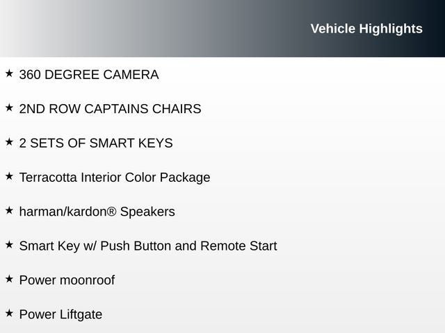 Step inside and be captivated by the Telluride's premium cabin, featuring the harman/kardon® Speakers, Smart Key with Push Button and Remote Start, Power Liftgate, and Heated & Ventilated Front Bucket Seats. The Power moonroof adds an extra touch of elegance, while the Terracotta Interior Color Package creates a sophisticated ambiance.