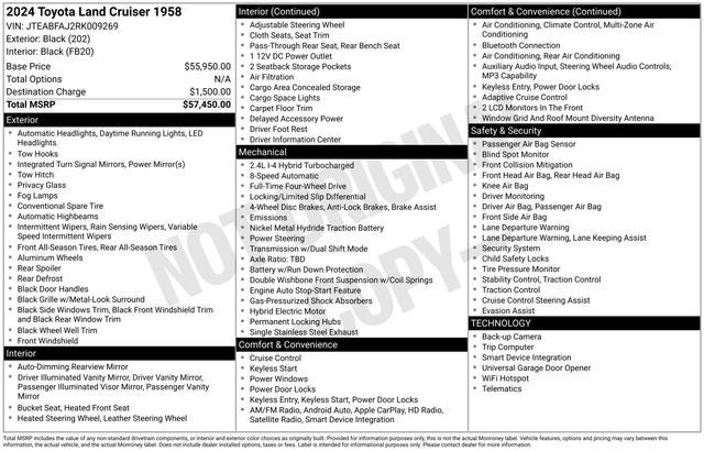 This 2024 Toyota Land Cruiser 1958 has been carefully inspected and certified, giving you the peace of mind of a comprehensive warranty and the confidence to take on any adventure. With its impressive fuel efficiency, delivering an EPA-estimated 22 MPG in the city and 25 MPG on the highway, this Land Cruiser balances power and practicality for the modern driver.