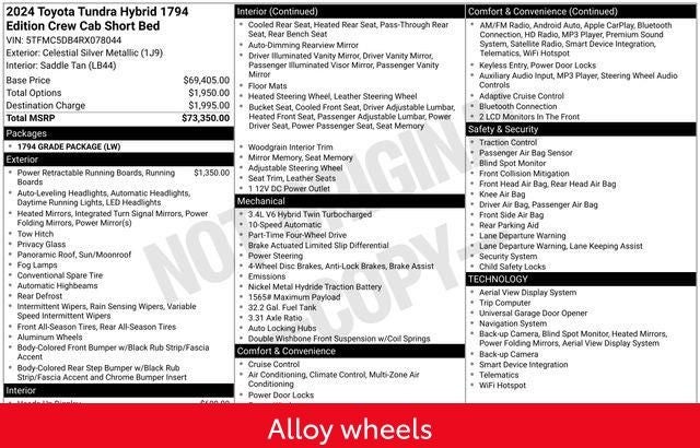 Experience the ultimate in truck capability and refinement with the 2024 Toyota Tundra Hybrid 1794 Edition. This exceptional vehicle is a true testament to Toyota's commitment to innovation and customer satisfaction. Visit our showroom today and let us demonstrate how this remarkable Tundra Hybrid can elevate your driving experience to new heights.