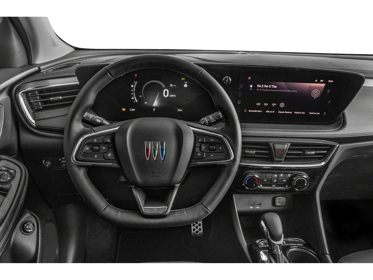 2 USB Ports (1 Type-A, 1 Type-C), 4-Way Manual Passenger Seat Adjuster, 4-Wheel Disc Brakes, 5.45 Final Drive Axle Ratio, 6 Speakers, 6-Way Manual Driver Seat Adjuster, ABS brakes, Air Conditioning, Alloy wheels, AM/FM radio: SiriusXM, Auto High-beam Headlights, Automatic temperature control, Brake assist, Bumpers: body-color, Compass, Delay-off headlights, Driver door bin, Driver vanity mirror, Dual front impact airbags, Dual front side impact airbags, Electronic Stability Control, Emergency communication system: OnStar and Buick connected services capable, Enhanced Performance 6-Speaker System, Front anti-roll bar, Front Bucket Seats, Front Center Armrest, Front reading lights, Front wheel independent suspension, Fully automatic headlights, Heated door mirrors, Illuminated entry, Knee airbag, Leatherette Seat Trim, Low tire pressure warning, Occupant sensing airbag, Outside temperature display, Overhead airbag, Overhead console, Panic alarm, Passenger door bin, Passenger vanity mirror, Power door mirrors, Power steering, Power windows, Preferred Equipment Group 1SD, Radio data system, Radio: Audio System w/AM/FM, Rear reading lights, Rear side impact airbag, Rear window defroster, Rear window wiper, Remote keyless entry, Ride & Handling Suspension, Security system, SiriusXM Trial Subscription, Speed control, Speed-sensing steering, Split folding rear seat, Spoiler, Sport steering wheel, Steering wheel mounted audio controls, Tachometer, Telescoping steering wheel, Tilt steering wheel, Traction control, Trip computer, Variably intermittent wipers, Wheels: 18 Gloss Black Aluminum, Wireless Apple CarPlay/Wireless Android Auto.