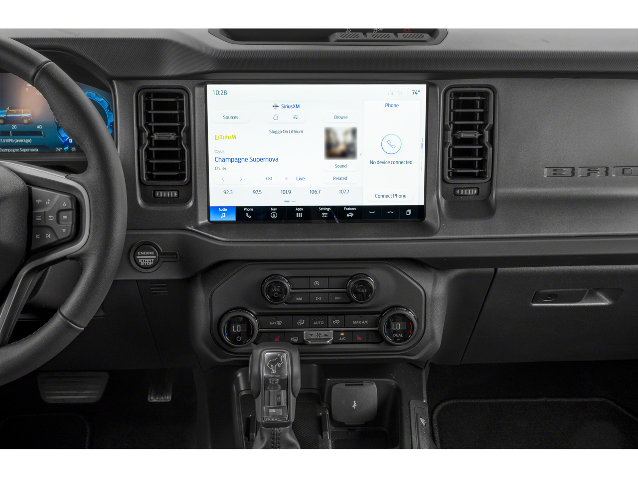 Step inside and you'll be greeted by a spacious and well-appointed interior. The Bronco's Cloth Bucket Seats provide all-day comfort, while the Split Folding Rear Seat offers versatility to accommodate your cargo. Dual Smart Charging USB Ports and the Power Outlet in the center console ensure your devices stay powered up.