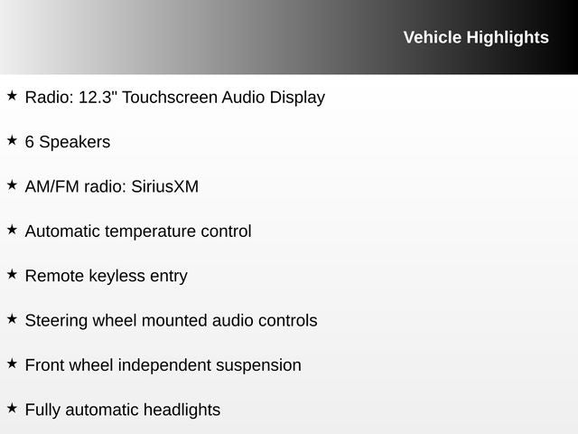 - Radio: 12.3" Touchscreen Audio Display -inc: SiriusXM, HD Radio, 6 speakers, USB connectivity, wired and wireless Apple CarPlay and Android Auto and audio and Bluetooth® hands-free w/steering remote control