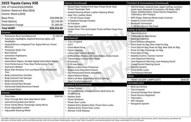 CARFAX One-Owner. Clean CARFAX. Reservoir Blue 2025 Toyota Camry XSE FWD eCVT 2.5L 4-Cylinder 16V DOHC ABS brakes, Active Cruise Control, Alloy wheels, Electronic Stability Control, Front dual zone A/C, Heated door mirrors, Heated Front Bucket Seats, Heated front seats, Illuminated entry, Leather Seat Trim, Low tire pressure warning, Remote keyless entry, Traction control.