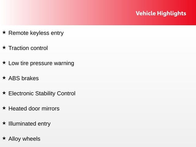 Recent Arrival! ABS brakes, Alloy wheels, Electronic Stability Control, Heated door mirrors, Illuminated entry, Low tire pressure warning, Remote keyless entry, Traction control.